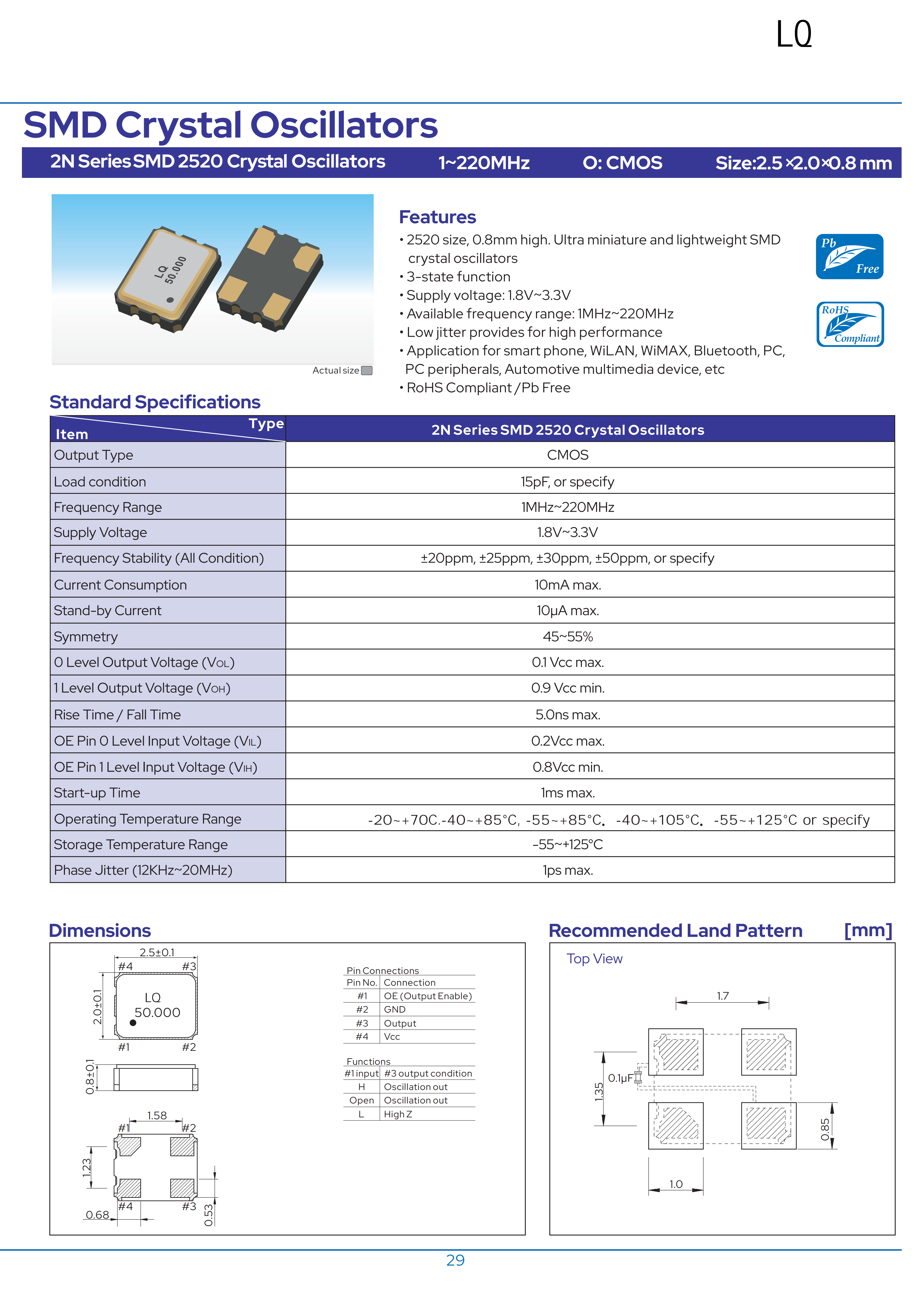 2520規(guī)格,高0.8毫米。超小型和輕型SMD晶體振蕩器