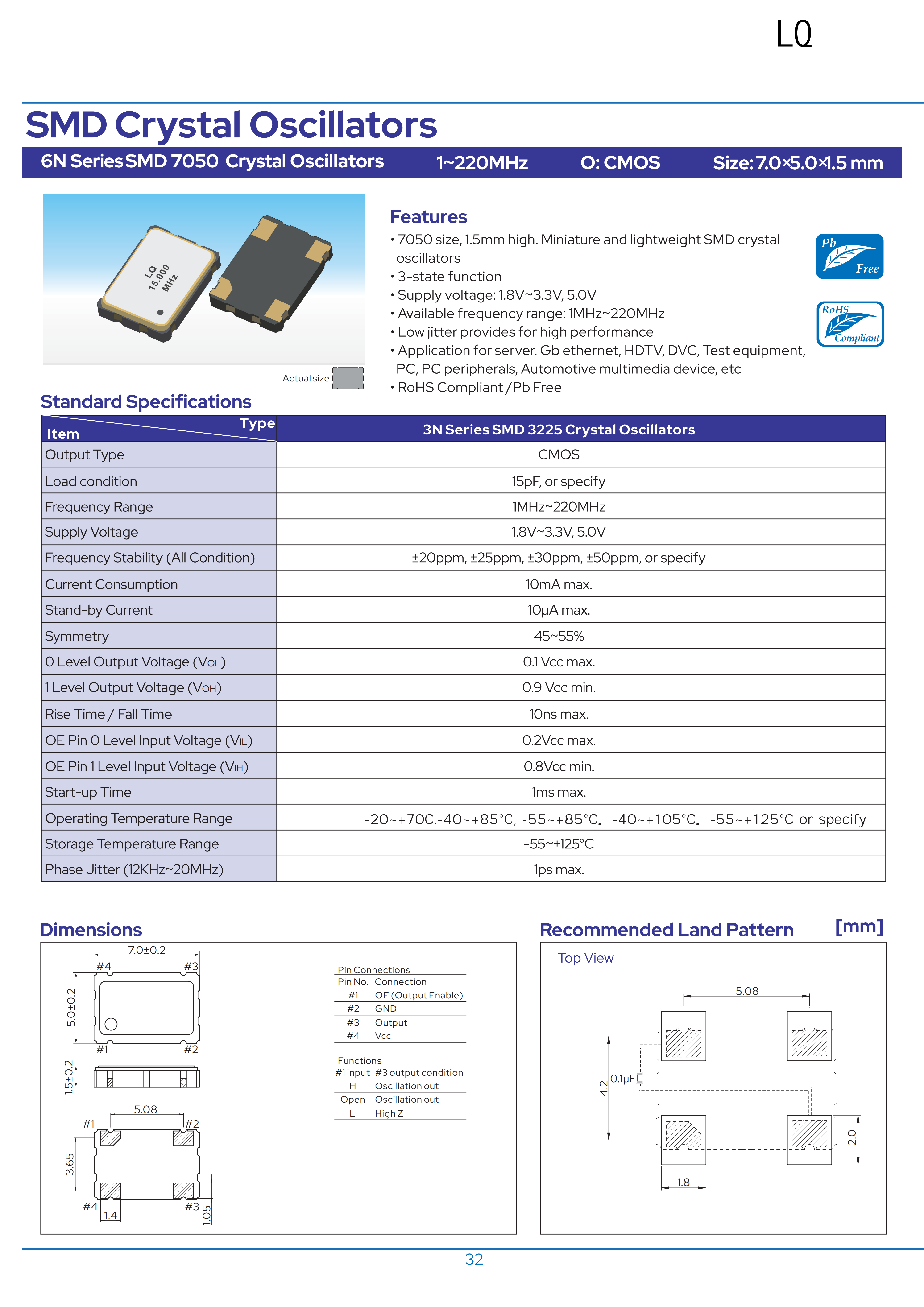 7050尺寸,高1.5毫米。微型和輕型SMD晶體振蕩器