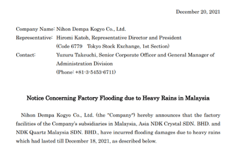NDK指出,此次因淹水而進行停工的為旗下子公司”Asian NDK Crystal SDN. BHD.(以下簡稱ANCSB)”和”NDK Quartz Malaysia SDN. BHD.(以下簡稱NQMSB)”,目前廠房已進行抽水、恢復(fù)作業(yè),不過由于大量生產(chǎn)線被淹,預(yù)計生產(chǎn)恢復(fù)要需要一段時間。