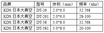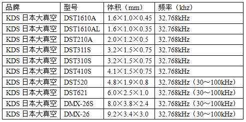 KDS晶體諧振器32.768KHZ系列的貼片晶振多以DST開頭命名,市場上常用的封裝有1.6*1.2mm,2.0*1.2mm,3.2*1.5mm,4.2*1.5mm,4.8*1.9mm,6.0*2.5mm(現(xiàn)今較少用),8.0*3.8mm,9.2*3.4mm,13.2*4.9mm。32.768KHZ系列的圓柱晶振多以DT開頭命名,市場上常用的封裝有2.0*6.0mm,3.0*8.0mm。