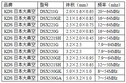 KDS晶振除了32.768K晶振,MHZ的晶振用途更為廣泛,常用的MHZ晶振頻率有8M、11.0592M、12M、13.56M、14.7458M、16M、19.2M、20M、22.1184M、22.5792M、24M、24.576M、25M、26,27M、32M、40M等,常用的貼片晶振規(guī)格尺寸有:2.0*1.6mm,2.0*2.5mm,3.2*2.5mm,5.0*3.2mm,6.0*3.5mm,5.0*7.0mm。KDS晶振MHZ系列產(chǎn)品多以DSX命名,數(shù)字以O(shè)結(jié)尾,晶振腳位則為2腳;數(shù)字以0以外的數(shù)字結(jié)尾,晶振腳位則為4腳。型號(hào)尾綴以GA或者G結(jié)尾,晶振表面為陶瓷面;型號(hào)尾綴以S或者SL,SH結(jié)尾,晶振表面為金屬面。