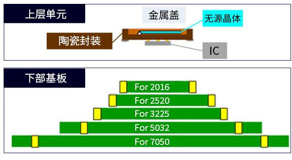 由無(wú)源晶體與振蕩IC組成上層單元與含有金屬配線的下部基板構(gòu)成京瓷獨(dú)特※的平臺(tái)化構(gòu)造。上層單元尺寸相同,下層基板尺寸根據(jù)客戶產(chǎn)品要求,無(wú)須按晶振尺寸分別設(shè)計(jì)不同大小的晶體,晶體底座,振蕩IC。實(shí)現(xiàn)了不同尺寸晶振的主要材料的共通化,從而縮短交貨期。
