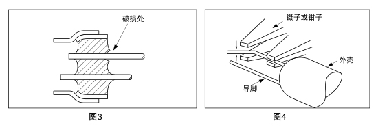 (1) 將導腳彎曲之后并進行焊接時,導腳上要留下離外殼0.5mm的直線部位。如果不留出導腳的直線部位而將導腳彎曲,有可能導致玻璃的破碎(參閱圖5和圖6)。