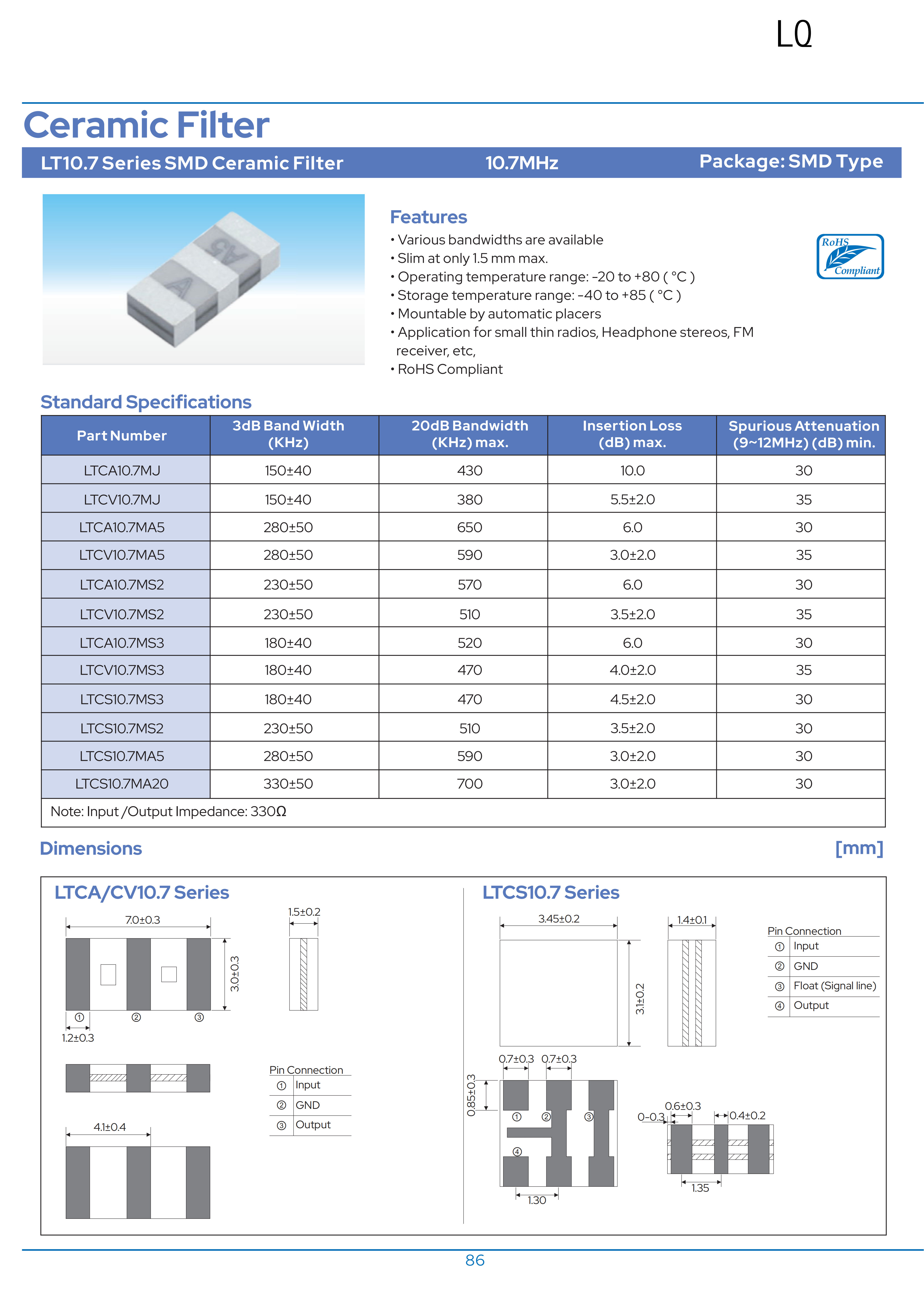 1. LTCA/LTCV 10.7MHz陶瓷濾波器采用貼片封裝, 7.0*3.0*1.5