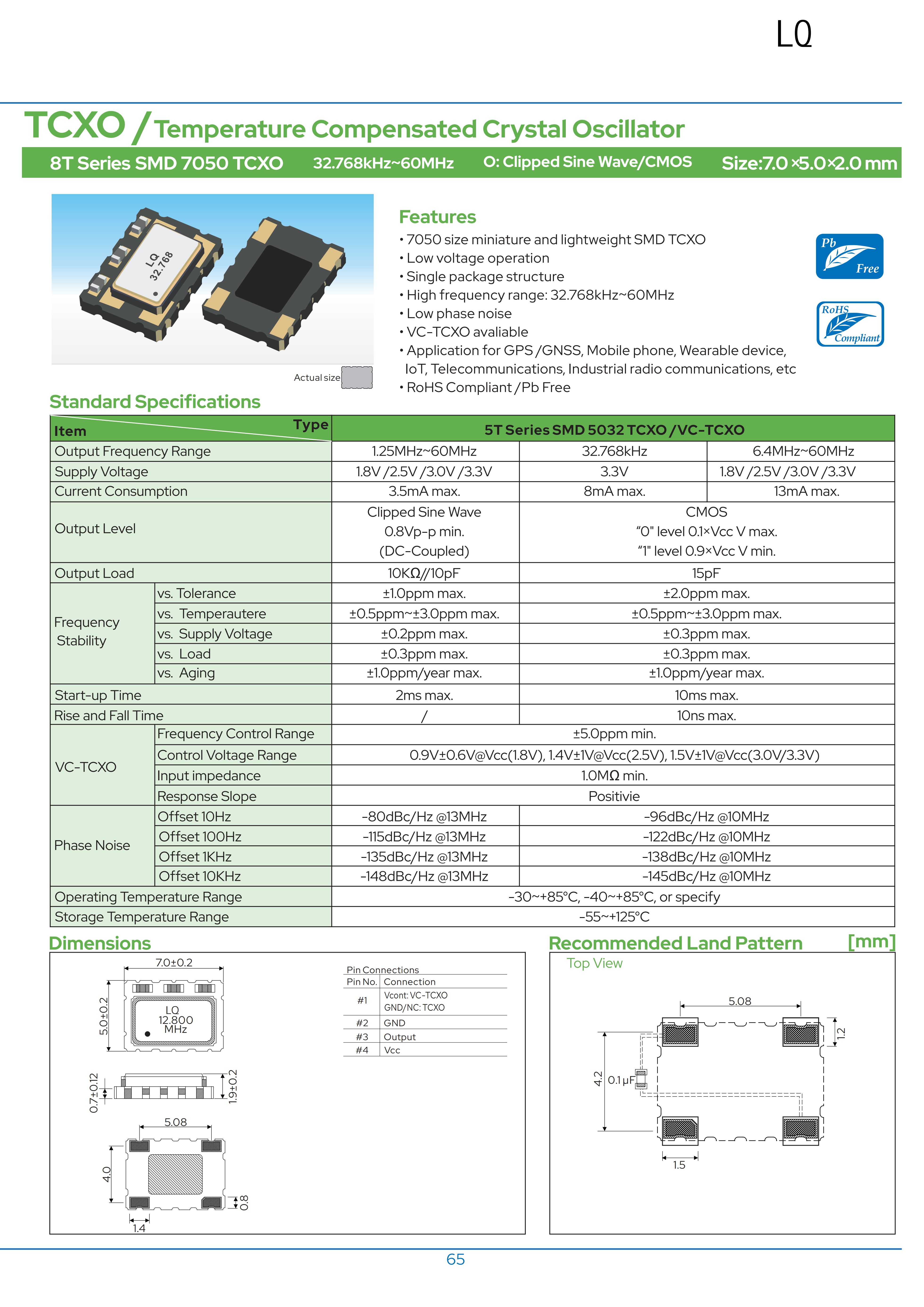 1. 貼片小型封裝SMD 7050溫補(bǔ)晶體振蕩器TCXO,7.0×5.0×2.0