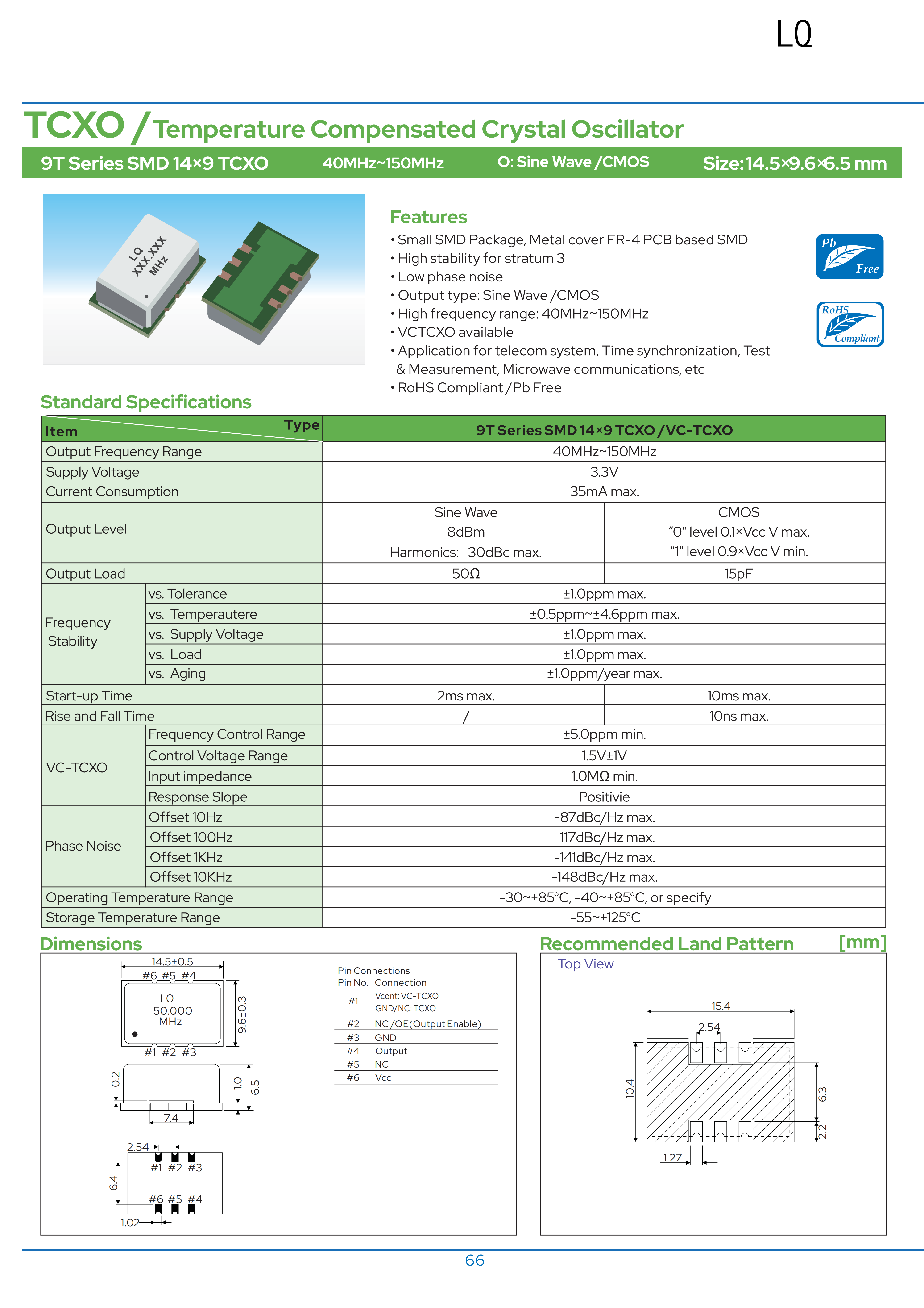 1. 小型SMD封裝溫補(bǔ)晶體振蕩器TCXO,尺寸14.5×9.6×6.5 mm,金屬蓋